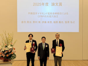 受賞した論文は、砥粒加工学会誌 第69巻1号(2025年)に掲載された「円筒型ダイヤモンド電着金網砥石による CFRP の大径穴加工」です。